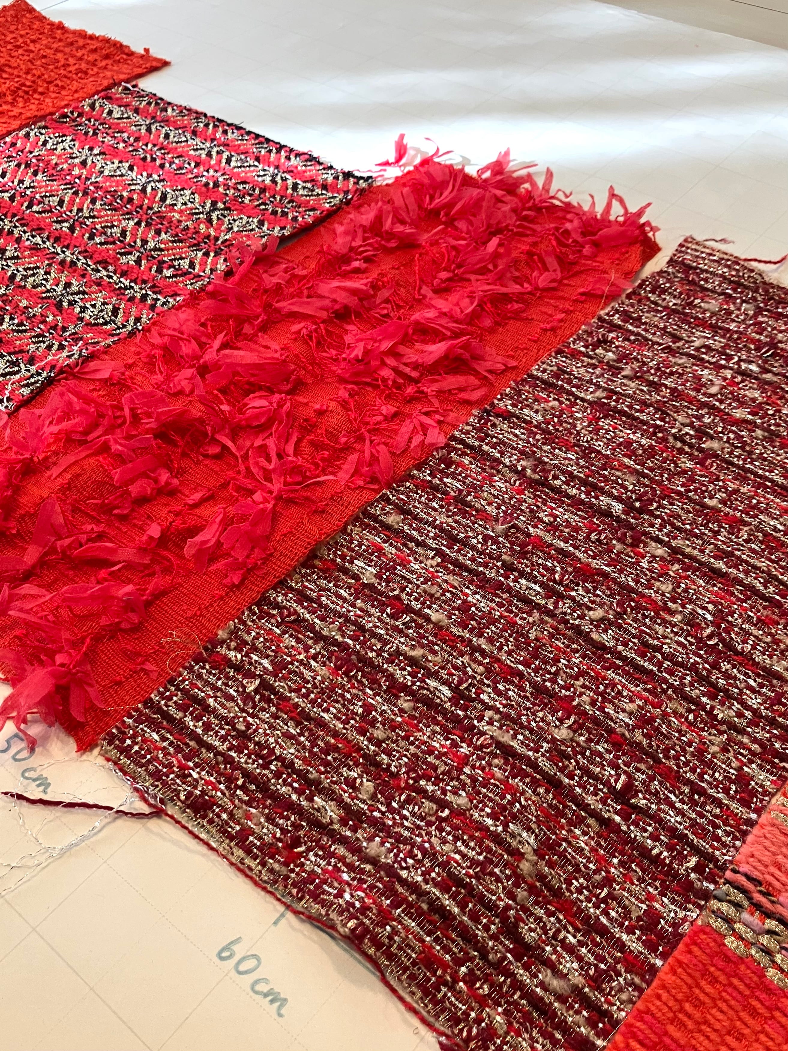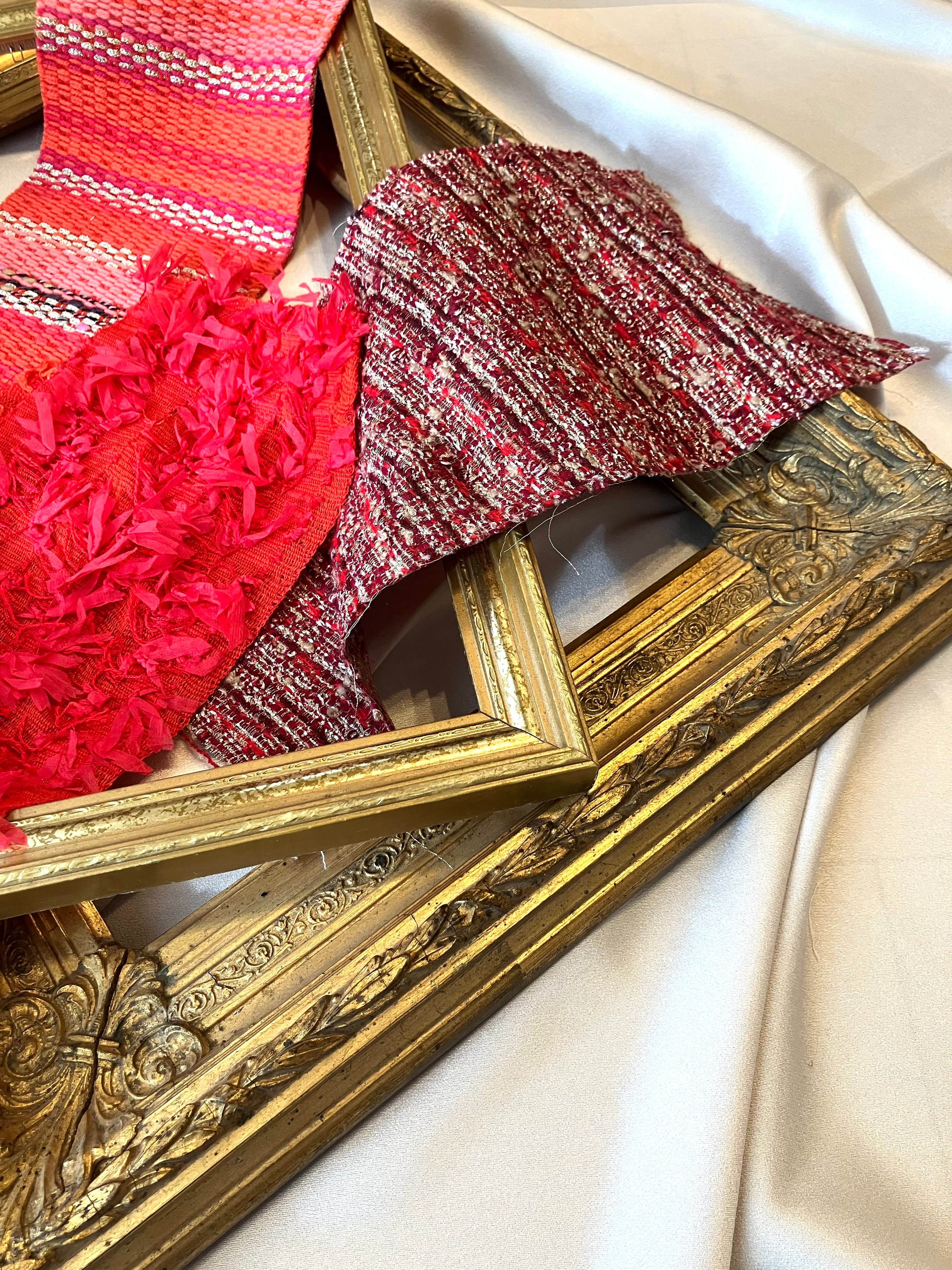 赤の鮮やかさが際立つデザインのツイード5片です。この美しい色合いは、見る人に強い印象を与え、空間を彩る特別な存在です。