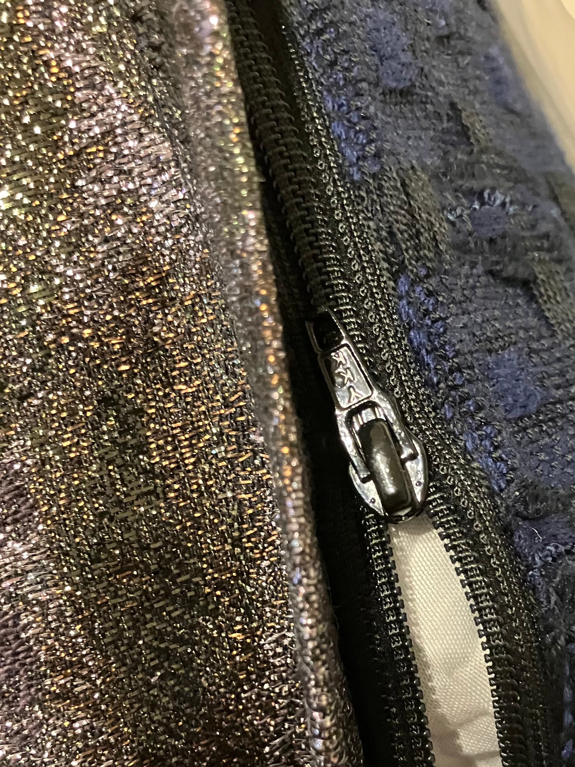 裏地には表地と同様に、オートクチュールの紺色の一枚布を使用しています。中材にはふんだんに綿が詰められています。チャックが付いているので、長く愛用していただく中で、綿を追加し、好みの厚さに調整することも可能です。