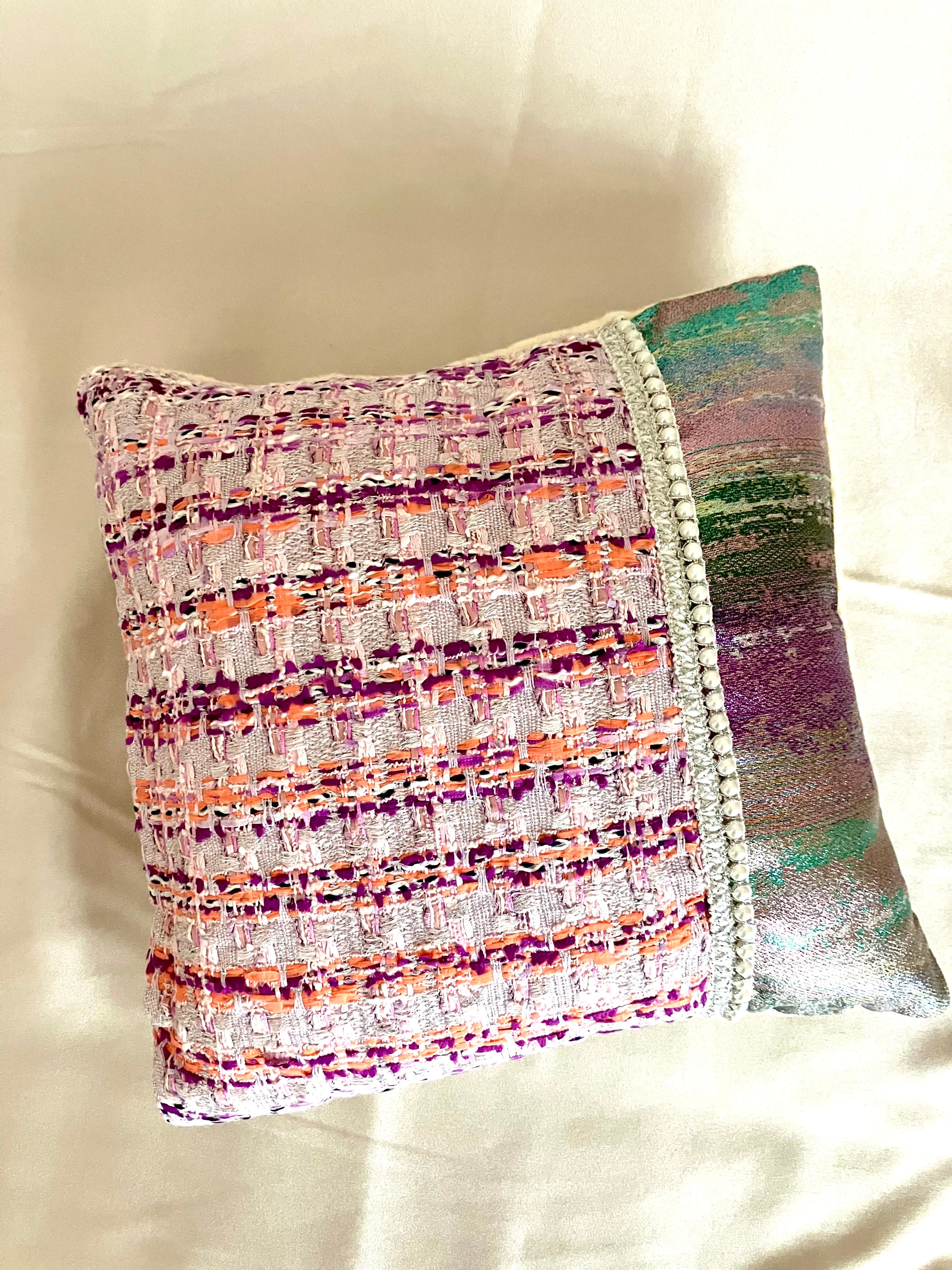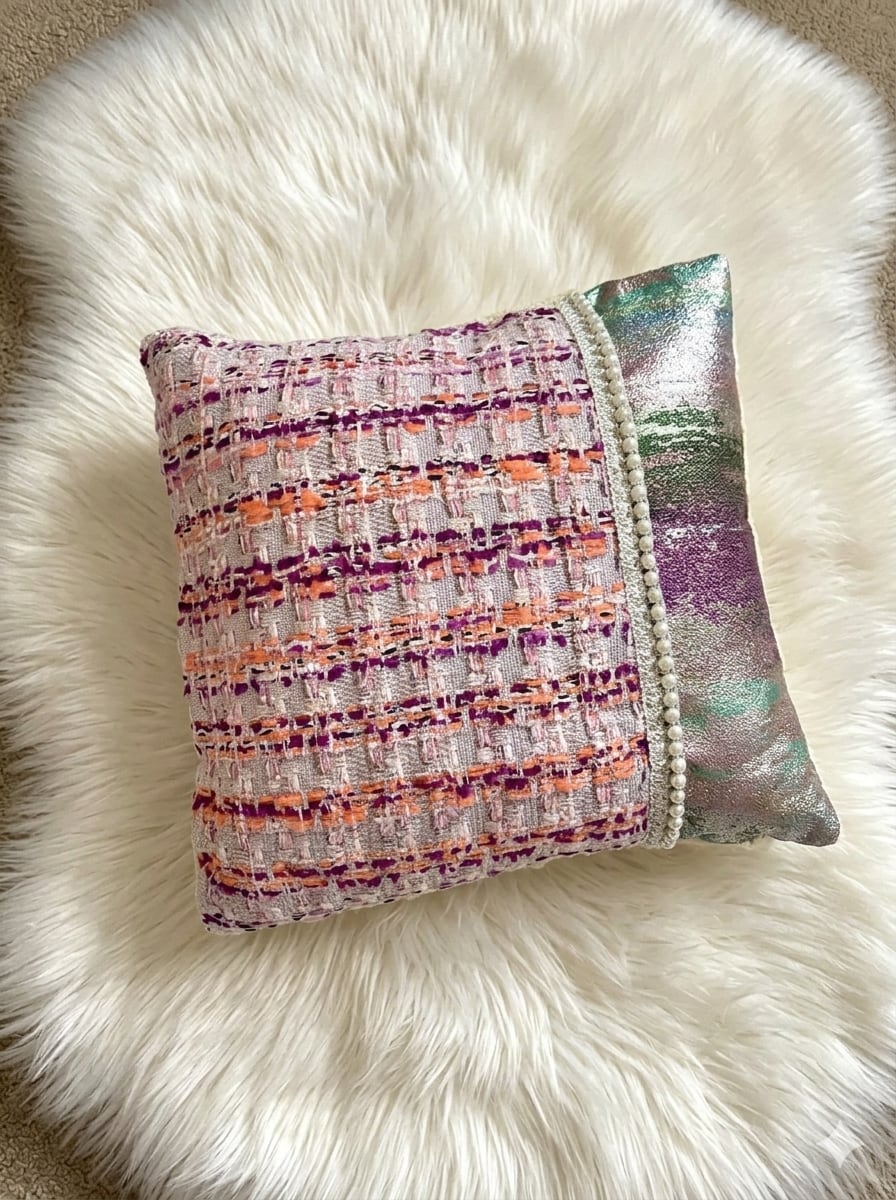 ピンクとシルバーの美しいコントラストが際立つFrenchTweedCushion005 petitは、エレガントでありながら可愛らしいデザインが魅力のミニクッションです。このアイテムは、パールフリンジが優雅さをプラスし、インテリアに特別なアクセントをもたらします。小さなサイズでも存在感があり、お部屋に華やかさを添えることでしょう。