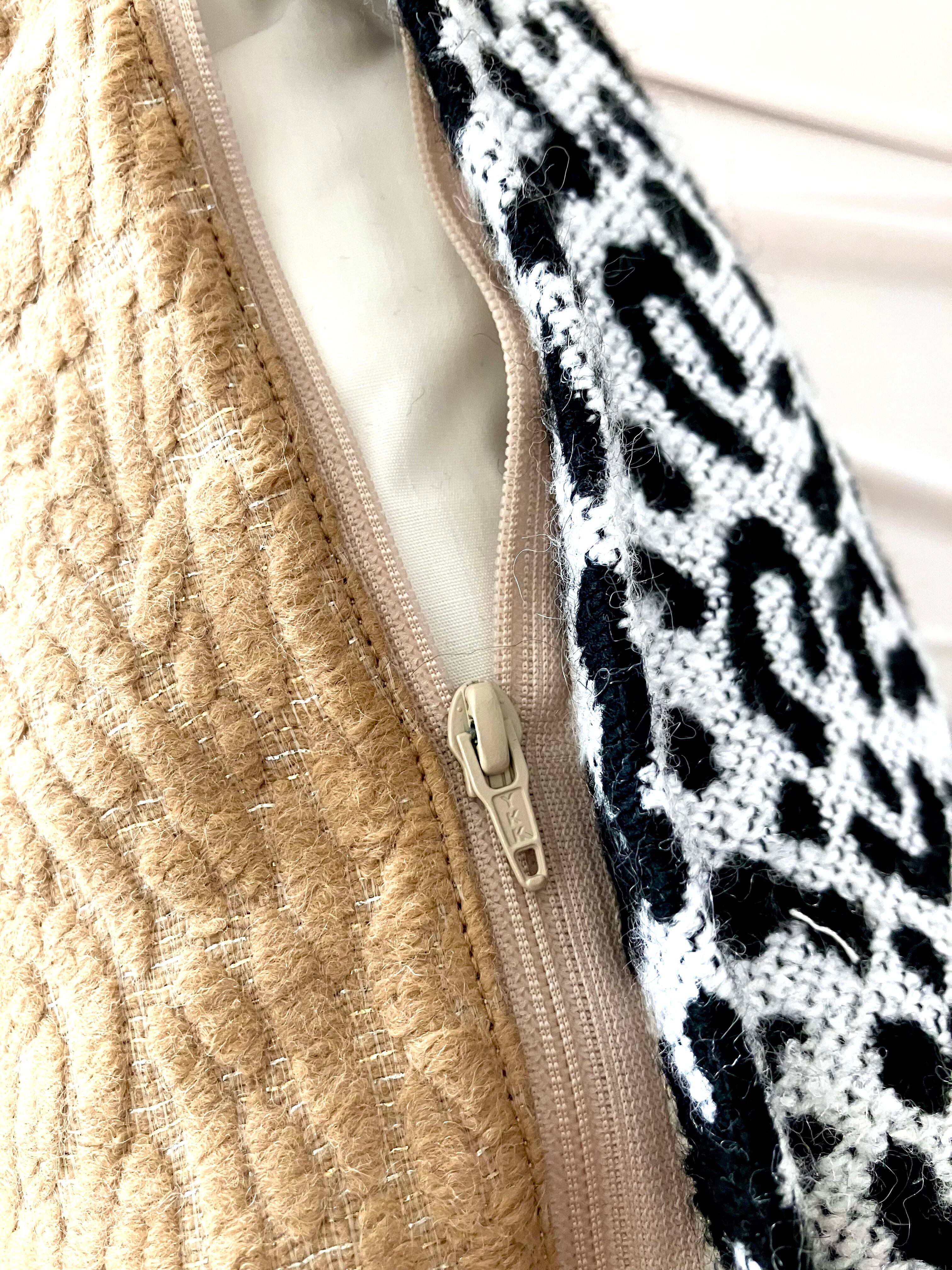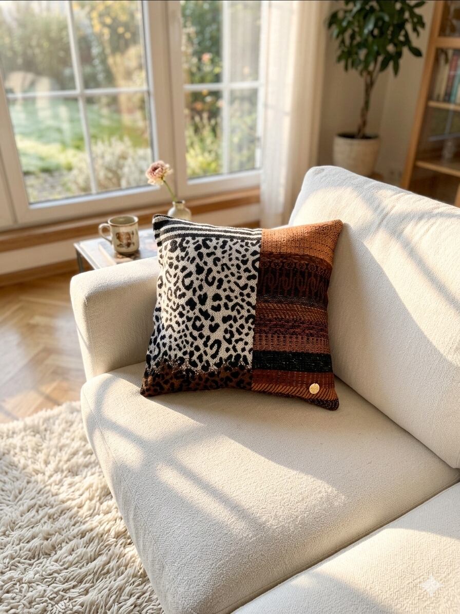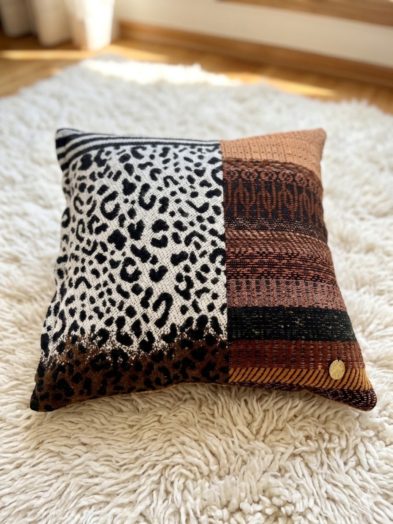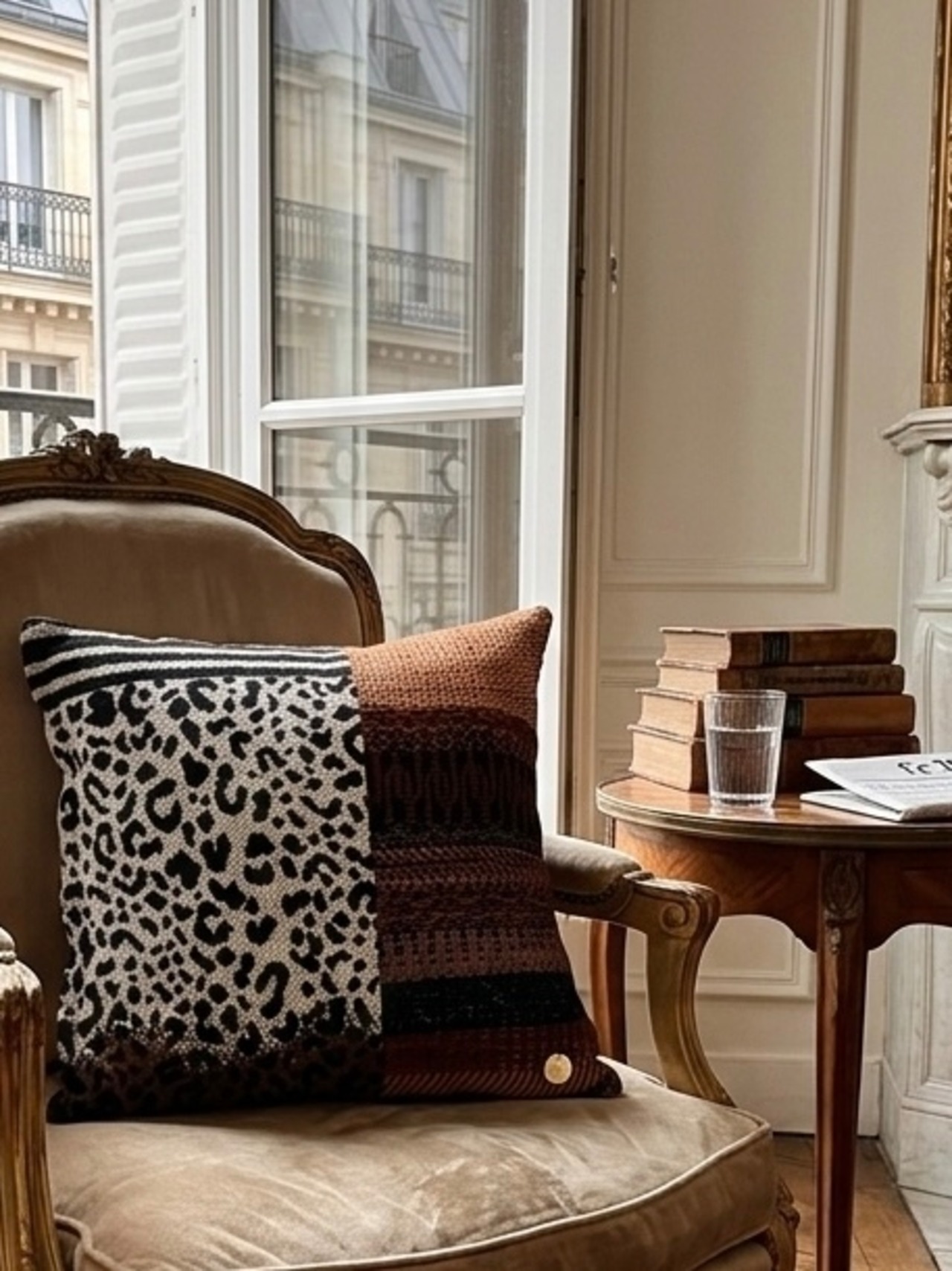 モノトーンのヒョウ柄とブラウンの大人ツイードが絶妙に組み合わさったFrench Tweed Cushion 007は、遊び心を持ちながらも洗練された雰囲気を醸し出すアイテムです。